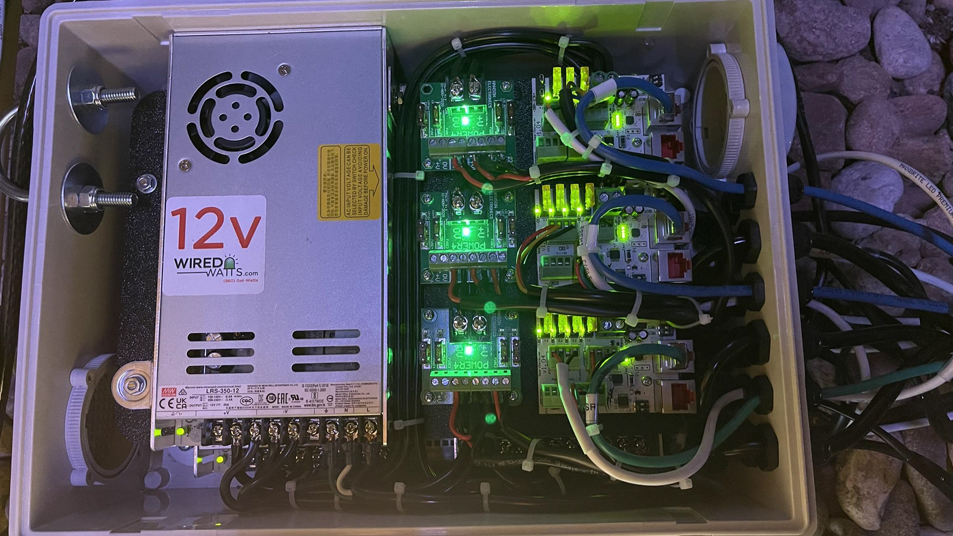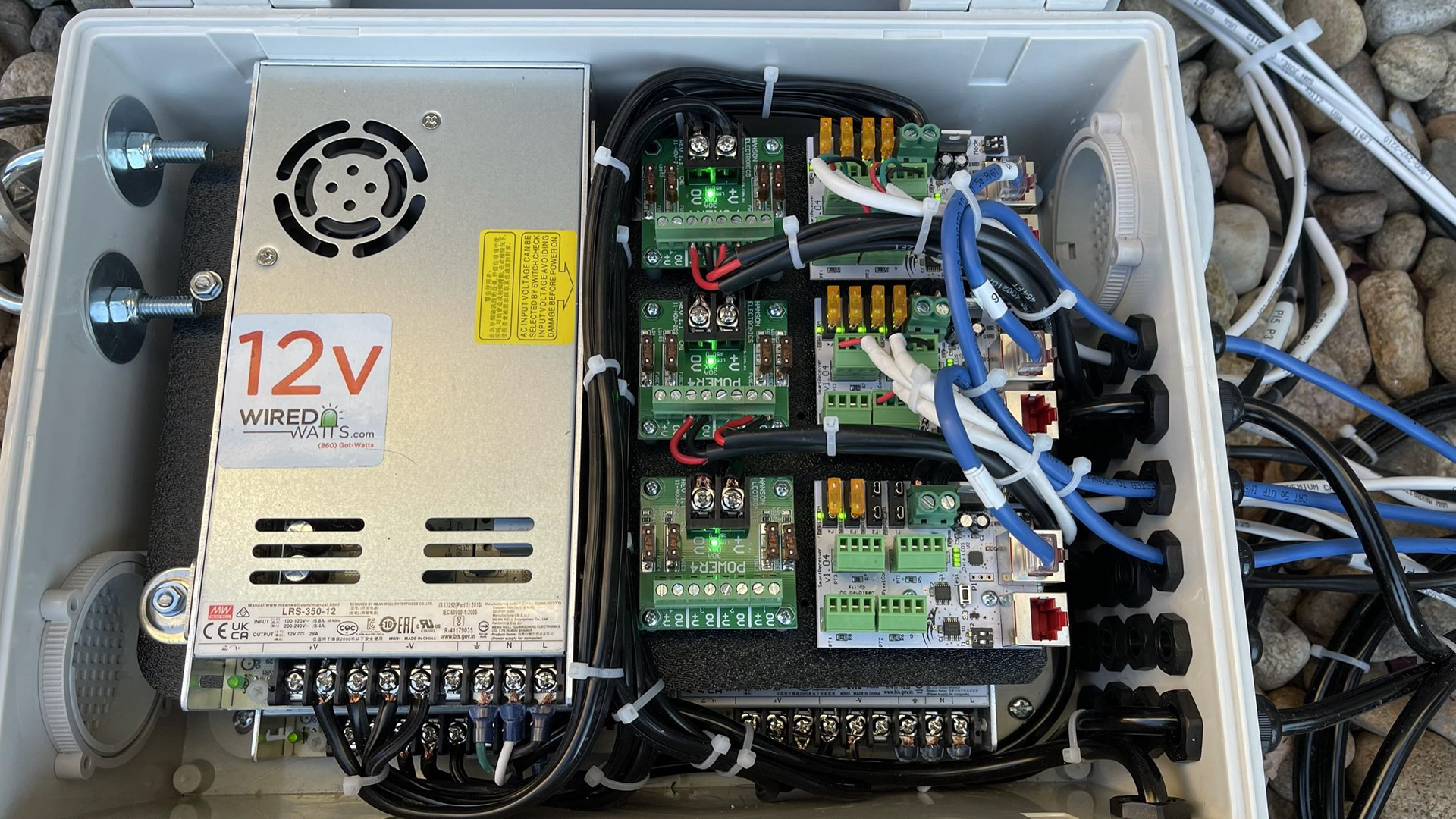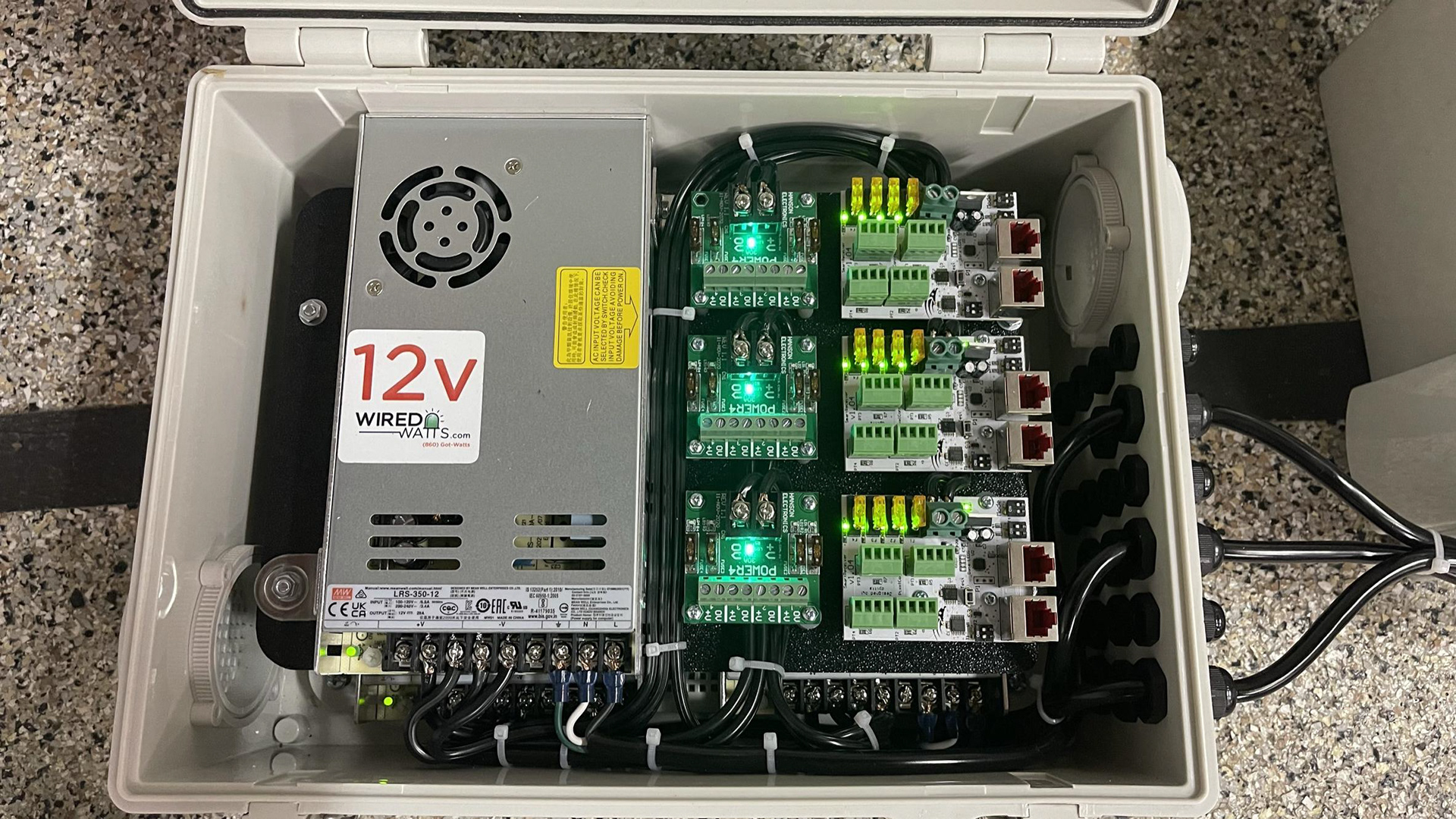 Each of the two boxes contained: (3) Meanwell 350W 12V Power Supplies, (3) Hanson Electronics Power Distribution Boards, and (3) Falcon Smart Receivers. The boxes were powered by a dedicated 30A 120V circuit with individual 10A circuit breakers for each power supply.