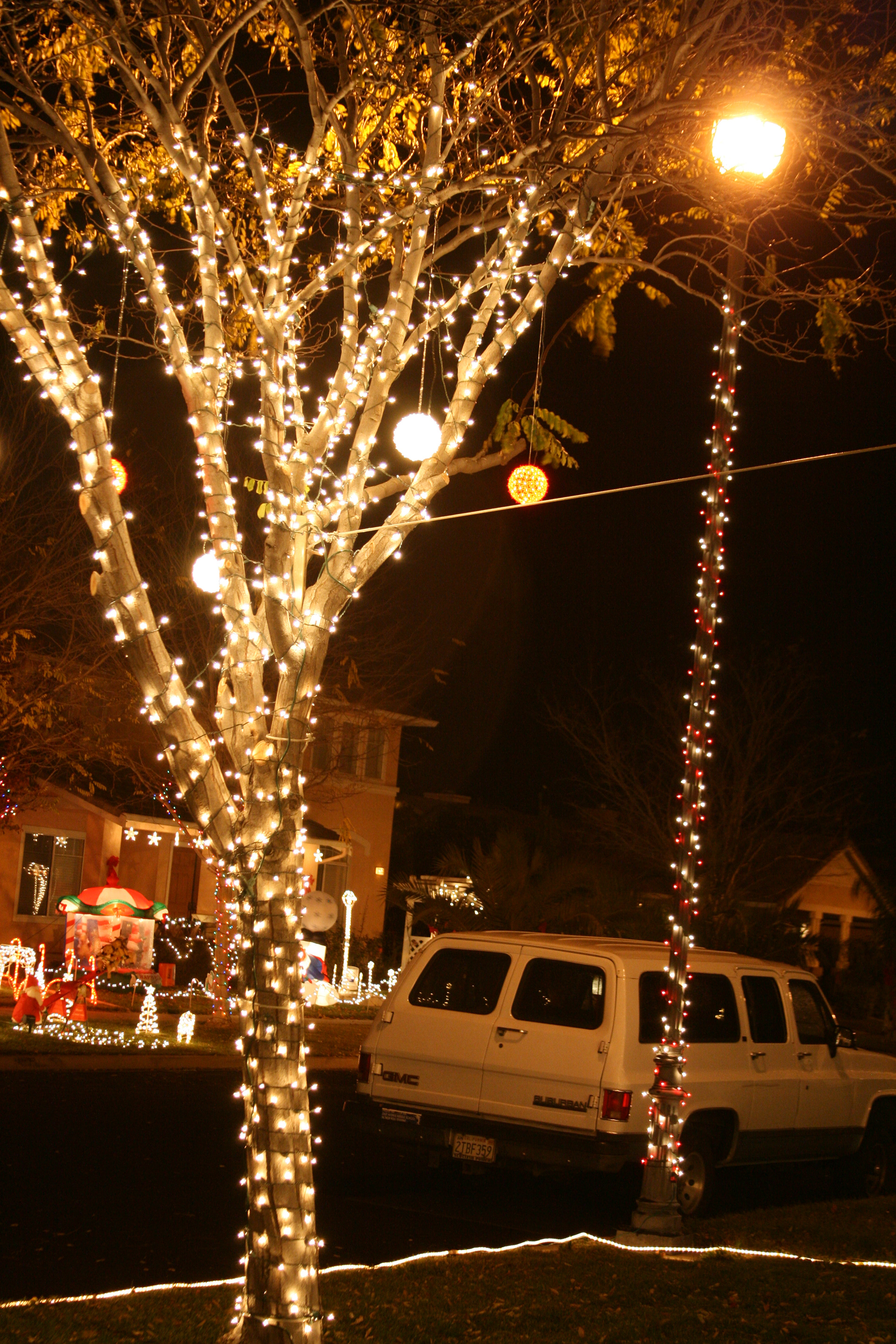 When we bought our first house in 2004 in Livermore, CA I FINALLY had a canvas of my own to paint with lights! And boy did I! Except for draping strings of lights down the walls on or the roof tiles, virtually every area of the house and yard was decorated.