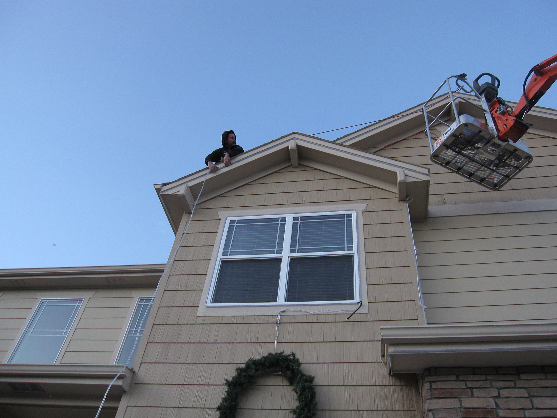 For our first Christmas in our new CO house, and since LED prices had come down to a more reasonable level, I decided to make the switch and go all in with LED. Given the 3-story height (off the back of the house with the walk-out basement) compared to the 1-story I was used to in CA, we decided to rent a lift and acquire some safety gear just to make the install a bit easier.